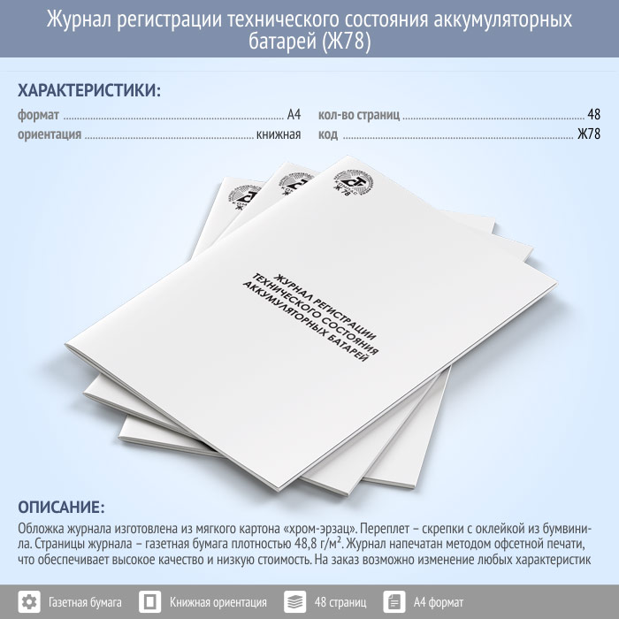 Журнал регистрации технического состояния аккумуляторных батарей (48 стр., Ж78) в Альметьевске купить