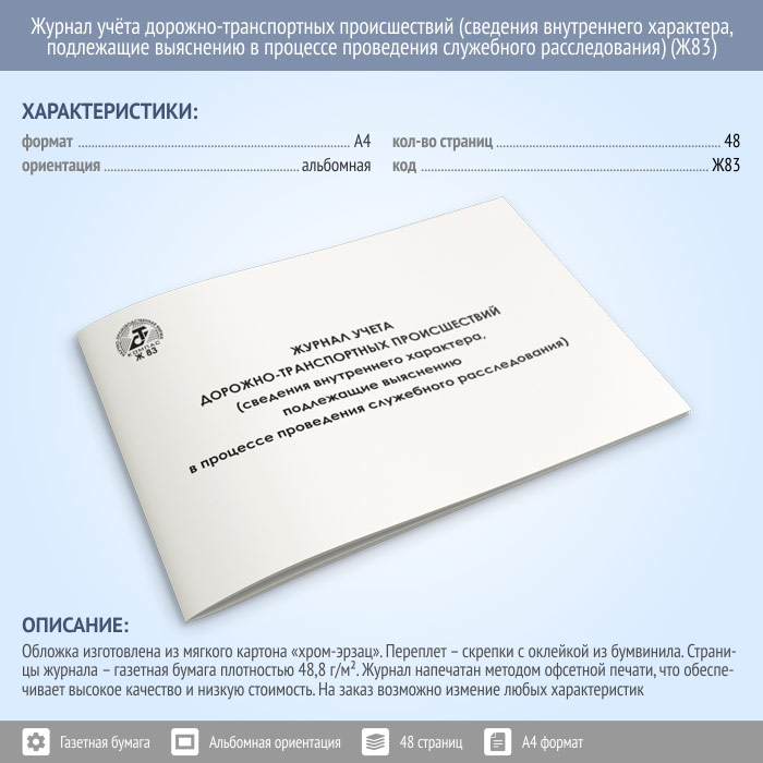 Журнал учета дорожно-транспортных происшествий (сведения внутреннего характера, подлежащие выяснению в процессе проведения служебного расследования) (48 стр., Ж83) в Альметьевске купить