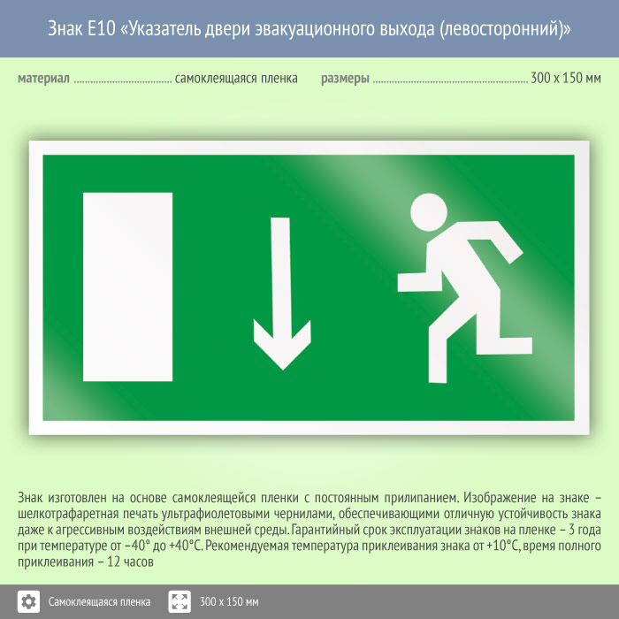 Знак «Указатель двери эвакуационного выхода (левосторонний)» размещается над дверью эвакуационного выхода слева. Код знака: E10