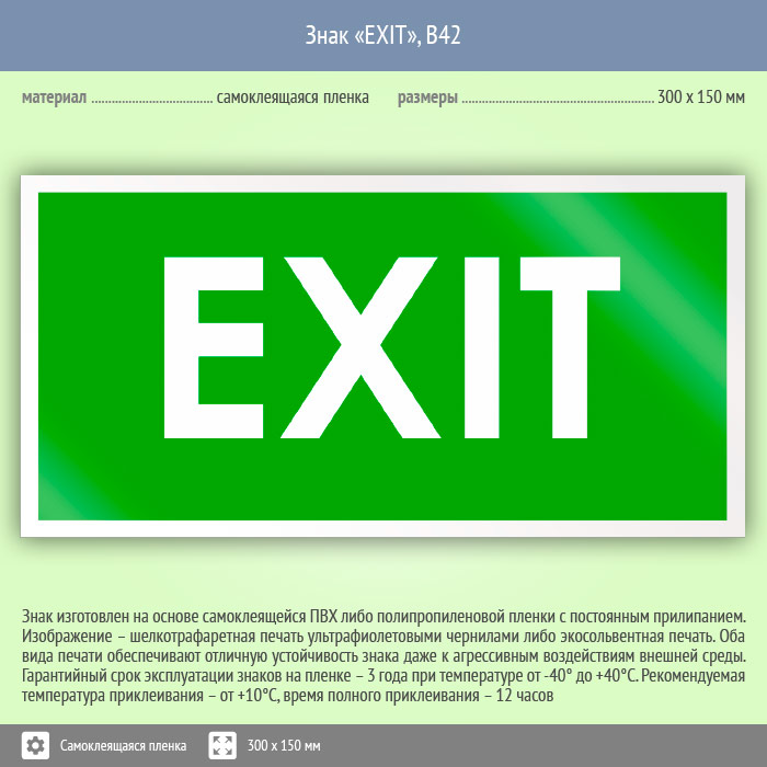 Знак «EXIT» может быть изготовлен любого размера на самоклеящейся пленке, пластике толщиной 0.5, 2 или 4 мм и металле. Также возможно применение фотолюминесцентных и световозвращающих материалов