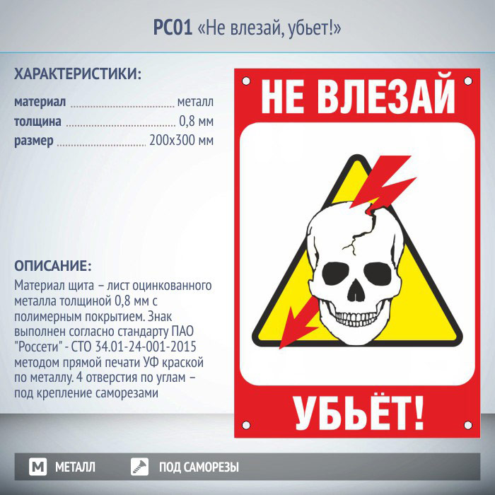 Знак «Не влезай, убьет!», РС01 (металл, 200х300 мм, отверстия под саморезы) в Альметьевске купить