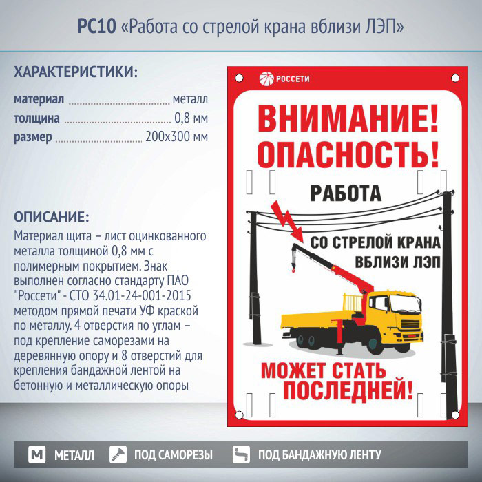 Знак «Работа со стрелой крана вблизи ЛЭП», РС10 (металл, 200х300 мм, отверстия под бандажную ленту) в Альметьевске купить