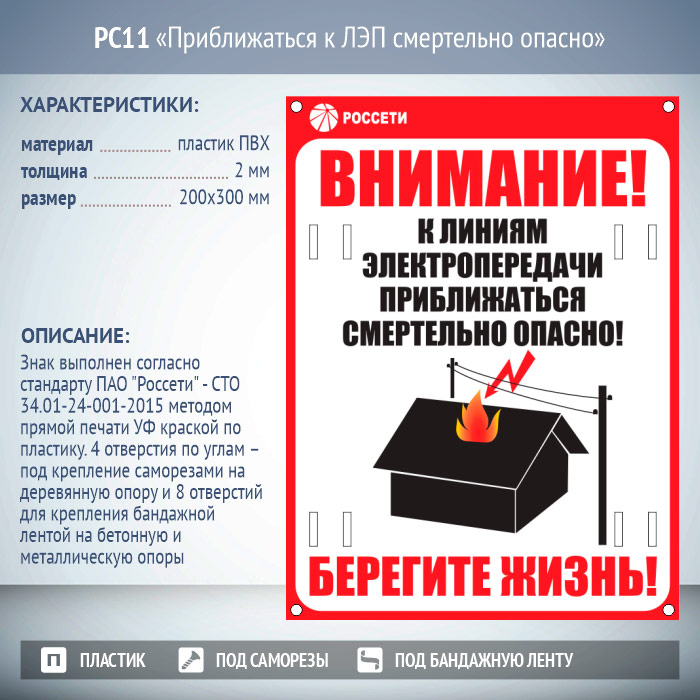 Знак «Приближаться к ЛЭП смертельно опасно», РС11 (пластик 2 мм, 200х300 мм, отверстия под бандажную ленту) в Альметьевске купить