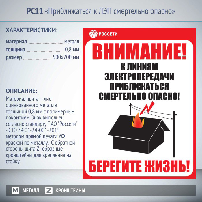 Информационный щит «Приближаться к ЛЭП смертельно опасно», РС11 (металл, 500х700 мм, кронштейны для крепления) в Альметьевске купить