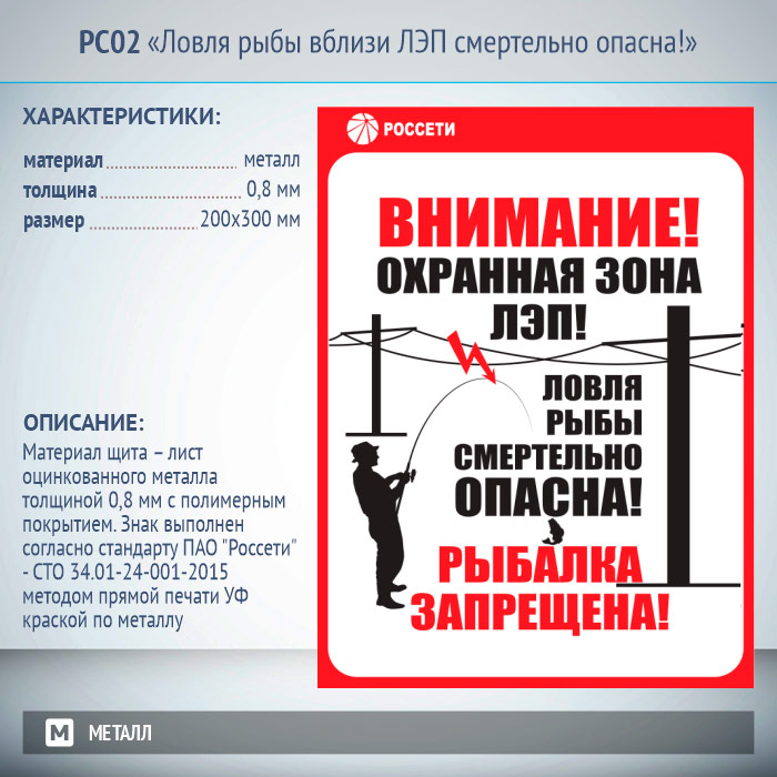 Знак «Ловля рыбы вблизи ЛЭП смертельно опасна!», РС02 (металл, 200х300 мм) в Альметьевске купить