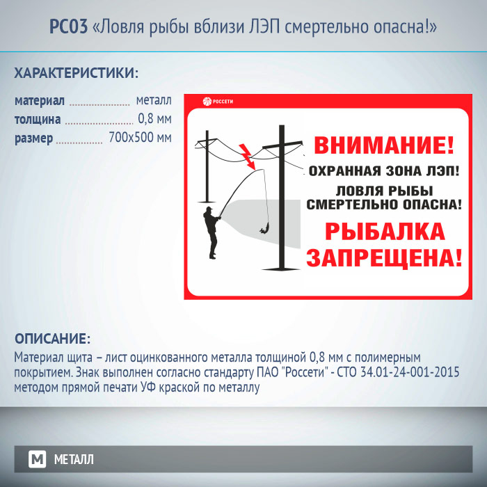 Информационный щит «Ловля рыбы вблизи ЛЭП смертельно опасна!», РС03 (металл, 700х500 мм) в Альметьевске купить