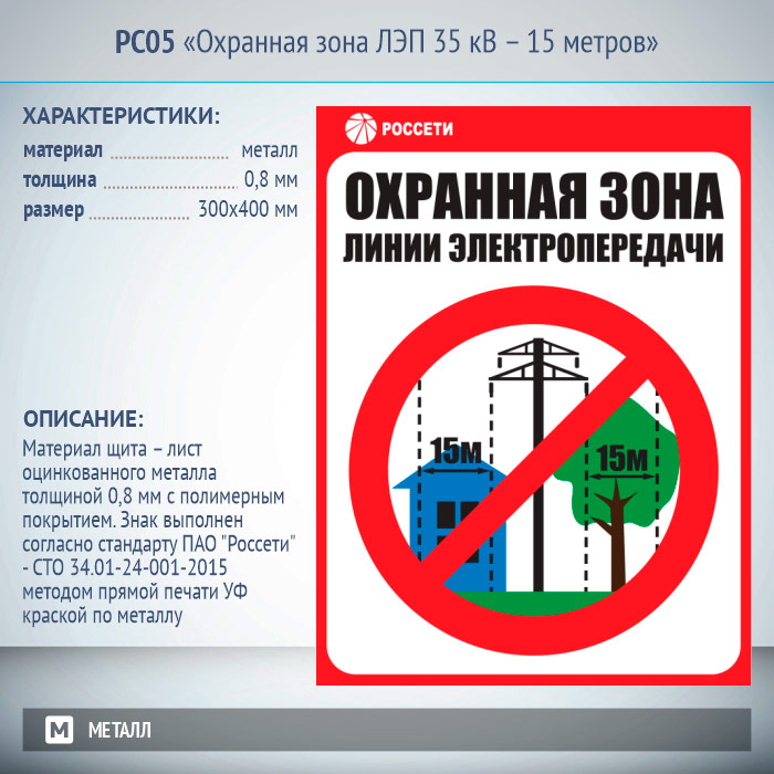 Знак «Охранная зона ЛЭП 35 кВ – 15 метров», РС05 (металл, 300х400 мм) в Альметьевске купить
