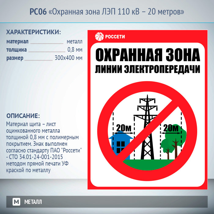 Знак «Охранная зона ЛЭП 110 кВ – 20 метров», РС06 (металл, 300х400 мм) в Альметьевске купить