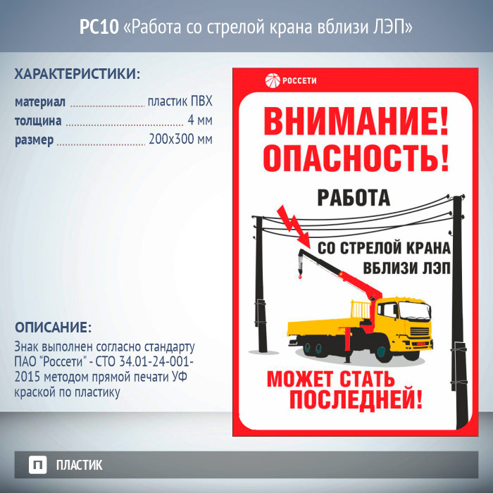 Знак «Работа со стрелой крана вблизи ЛЭП», РС10 (пластик 2 мм, 200х300 мм) в Альметьевске купить