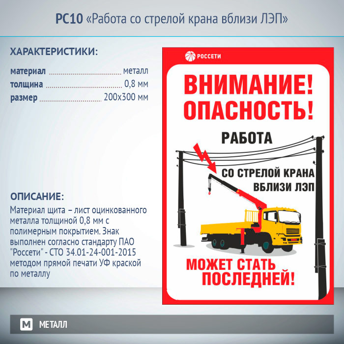 Знак «Работа со стрелой крана вблизи ЛЭП», РС10 (металл, 200х300 мм) в Альметьевске купить