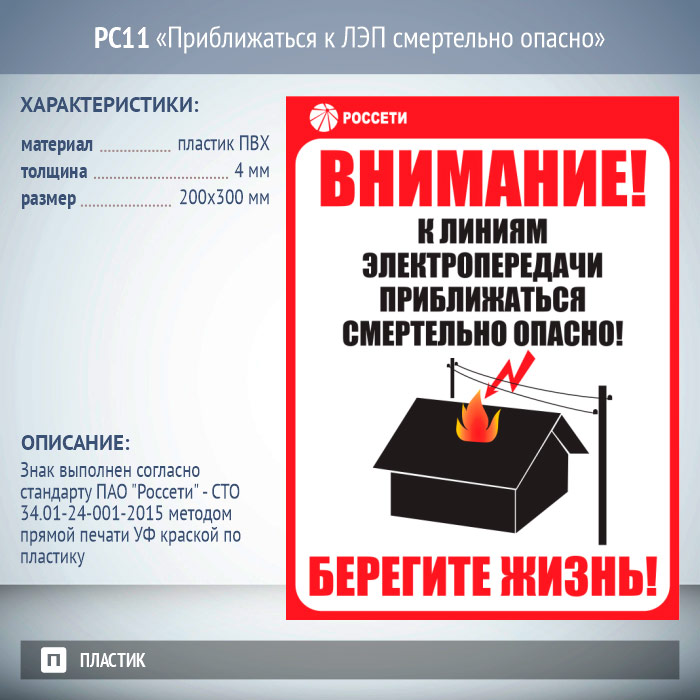 Знак «Приближаться к ЛЭП смертельно опасно», РС11 (пластик 2 мм, 200х300 мм) в Альметьевске купить