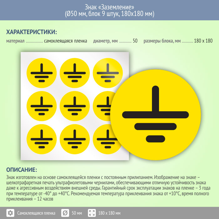 Знак (плакат) «Заземление», S46 (пленка, диаметр 50 мм, блок 9 штук, 180х180 мм) в Альметьевске купить
