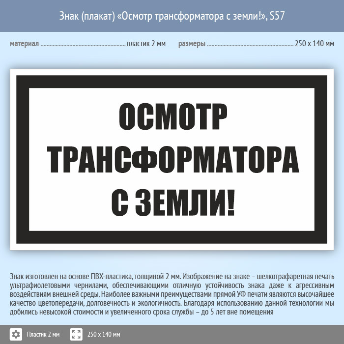 Знак (плакат) «Осмотр трансформатора с земли!», S57 (пластик, 250х140 мм) в Альметьевске купить