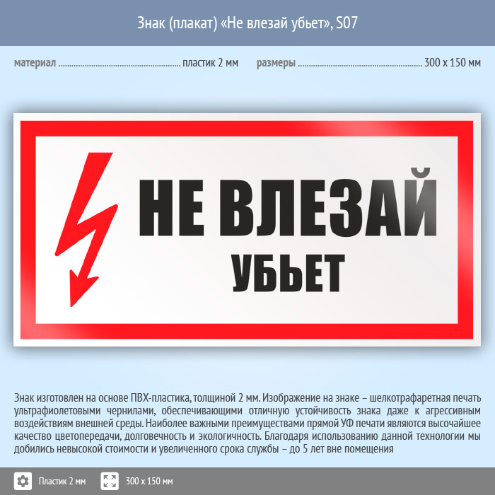 Знак (плакат) «Не влезай убьет», S07 (пластик, 300х150 мм) в Альметьевске купить