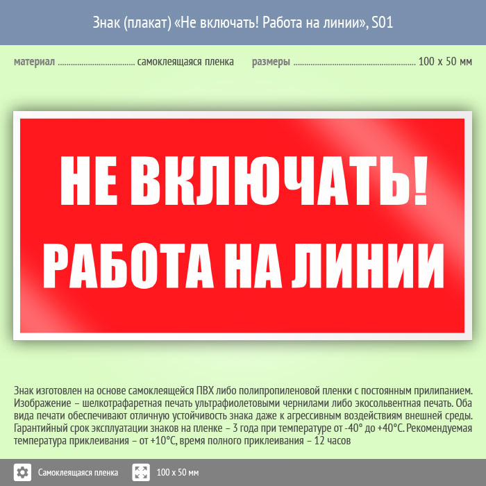 Знак (плакат) «Не включать! Работа на линии», S01 (пленка, 100х50 мм) в Альметьевске купить