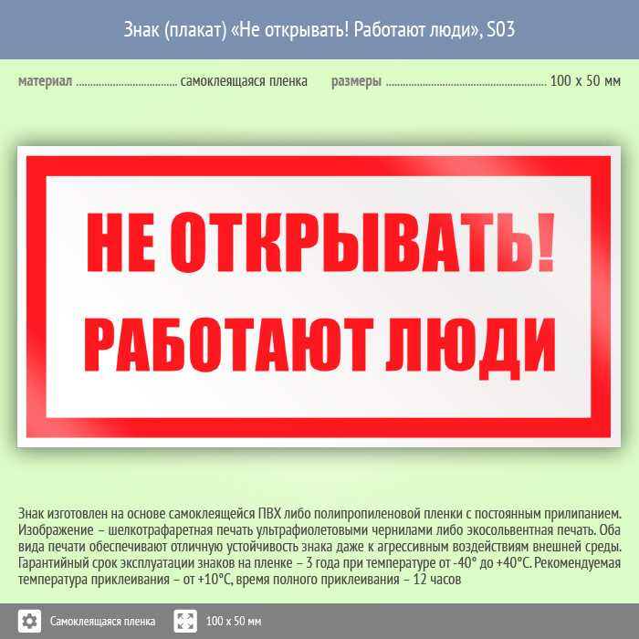 Знак (плакат) «Не открывать! Работают люди», S03 (пленка, 100х50 мм) в Альметьевске купить
