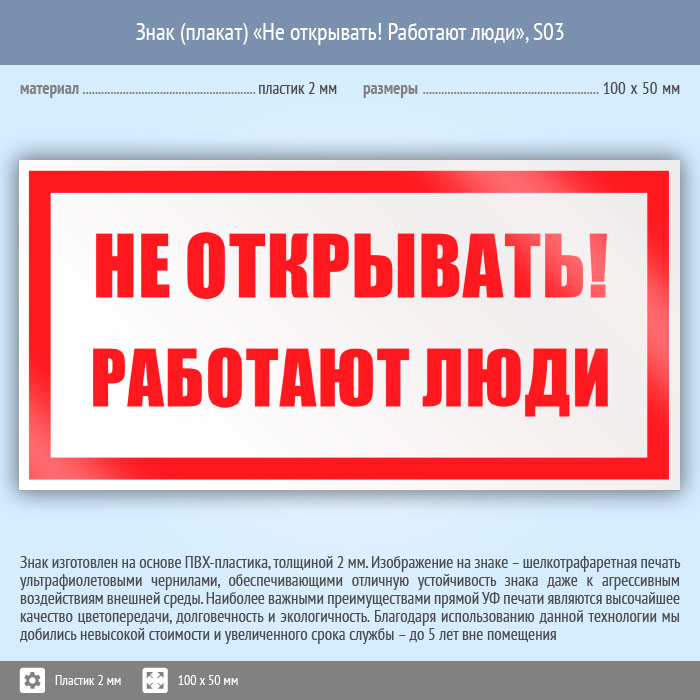 Знак (плакат) «Не открывать! Работают люди», S03 (пластик, 100х50 мм) в Альметьевске купить