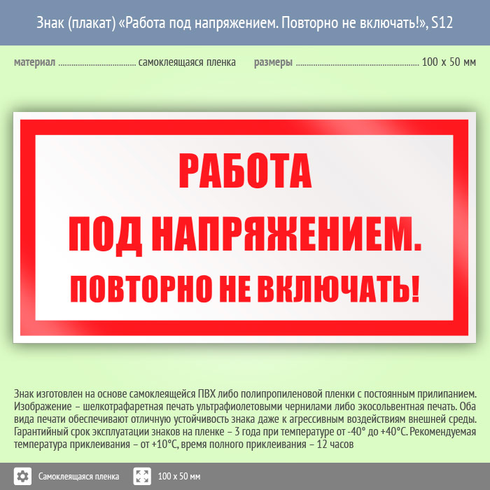 Знак (плакат) «Работа под напряжением. Повторно не включать!», S12 (пленка, 100х50 мм) в Альметьевске купить