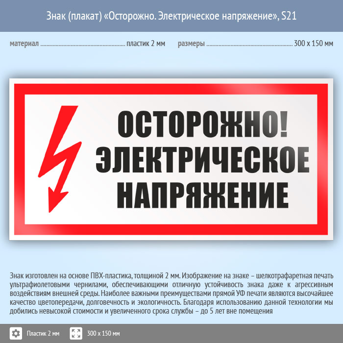 Знак (плакат) «Осторожно. Электрическое напряжение», S21 (пластик, 300х150 мм) в Альметьевске купить