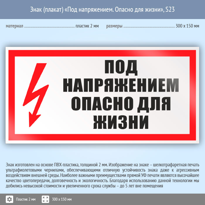 Знак (плакат) «Под напряжением. Опасно для жизни», S23 (пластик, 300х150 мм) в Альметьевске купить