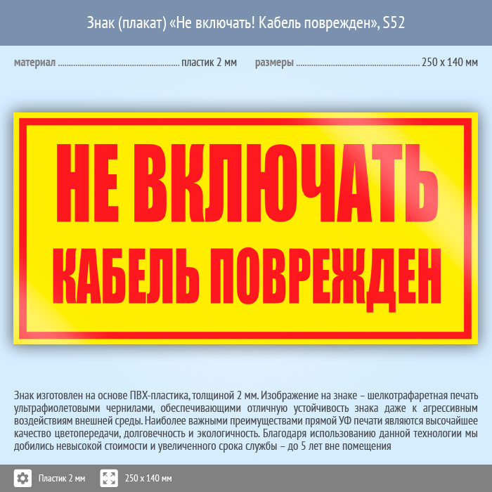 Знак (плакат) «Не включать! Кабель поврежден», S52 (пластик, 250х140 мм) в Альметьевске купить
