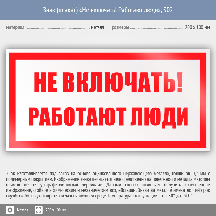 Знак (плакат) «Не включать! Работают люди», S02 (металл, 200х100 мм) в Альметьевске купить