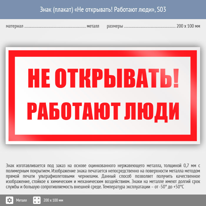Знак (плакат) «Не открывать! Работают люди», S03 (металл, 200х100 мм) в Альметьевске купить