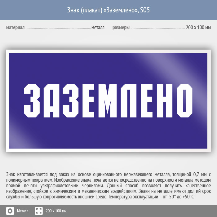 Знак (плакат) «Заземлено», S05 (металл, 200х100 мм) в Альметьевске купить