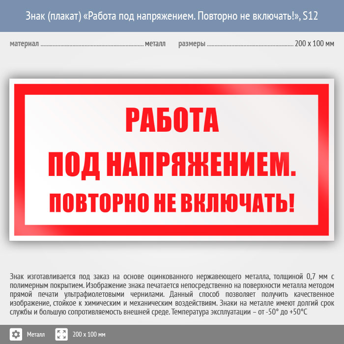 Знак (плакат) «Работа под напряжением. Повторно не включать!», S12 (металл, 200х100 мм) в Альметьевске купить