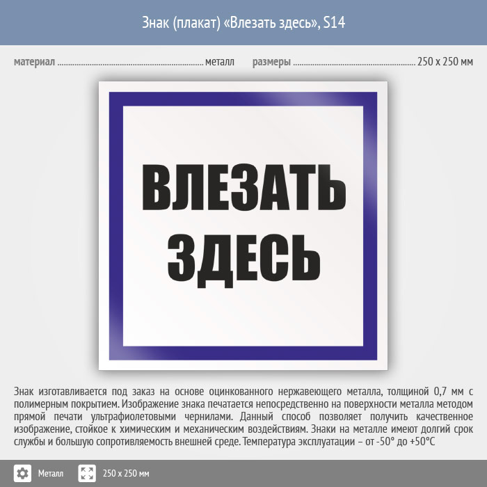 Знак (плакат) «Влезать здесь», S14 (металл, 250х250 мм) в Альметьевске купить