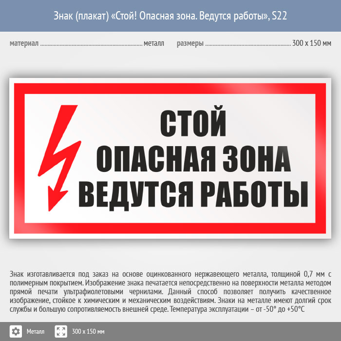 Знак (плакат) «Стой! Опасная зона. Ведутся работы», S22 (металл, 300х150 мм) в Альметьевске купить