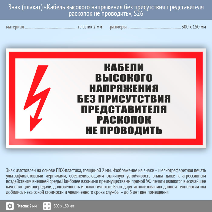Знак (плакат) «Кабель высокого напряжения без присутствия представителя раскопок не проводить», S26 (пластик, 300х150 мм) в Альметьевске купить