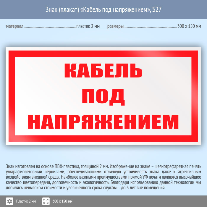 Знак (плакат) «Кабель под напряжением», S27 (пластик, 300х150 мм) в Альметьевске купить