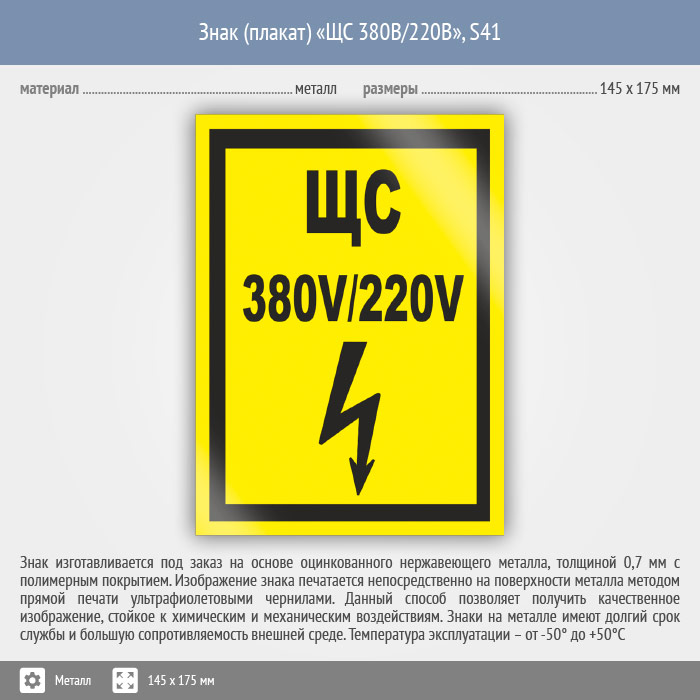 Знак (плакат) «ЩС 380В/220В», S41 (металл, 145х175 мм) в Альметьевске купить