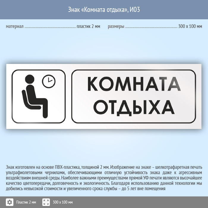 Знак «Комната отдыха», И03 (пластик, 300х100 мм) в Альметьевске купить