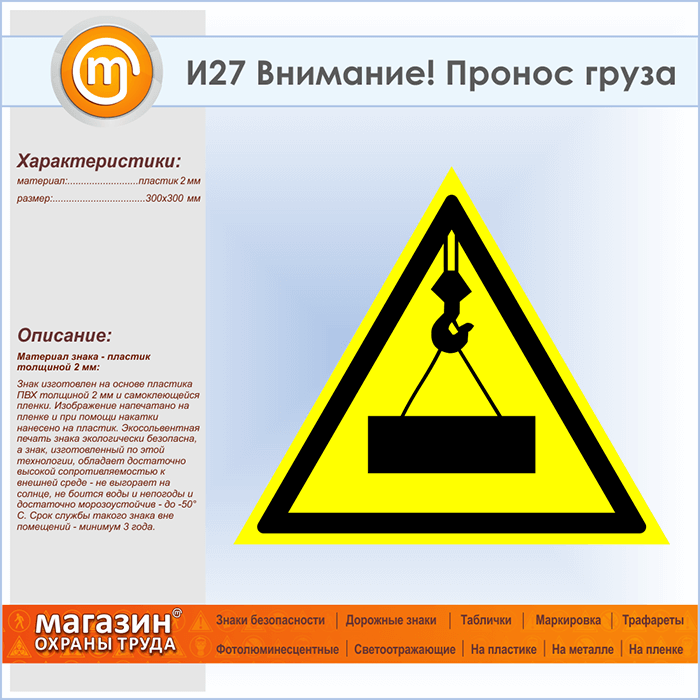Знак «Внимание! Пронос груза», И27 (пластик, сторона 300 мм) в Альметьевске купить