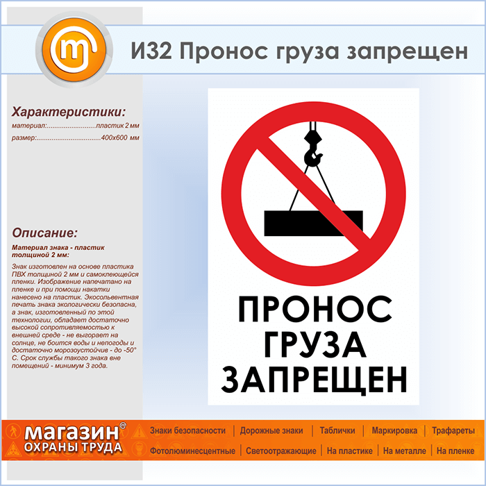 Знак «Пронос груза запрещен», И32 (пластик, 400х600 мм) в Альметьевске купить