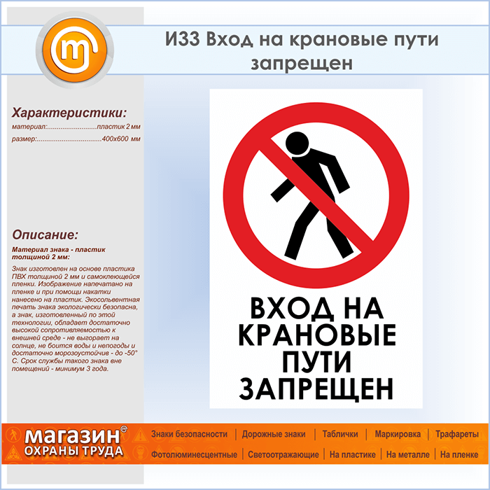 Знак «Вход на крановые пути запрещен», И33 (пластик, 400х600 мм) в Альметьевске купить