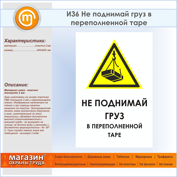 Знак «Не поднимай груз в переполненной таре», И36 (пластик, 400х600 мм) в Альметьевске купить