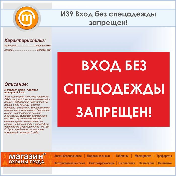 Знак «Вход без спецодежды запрещен!», И39 (пластик, 600х400 мм) в Альметьевске купить