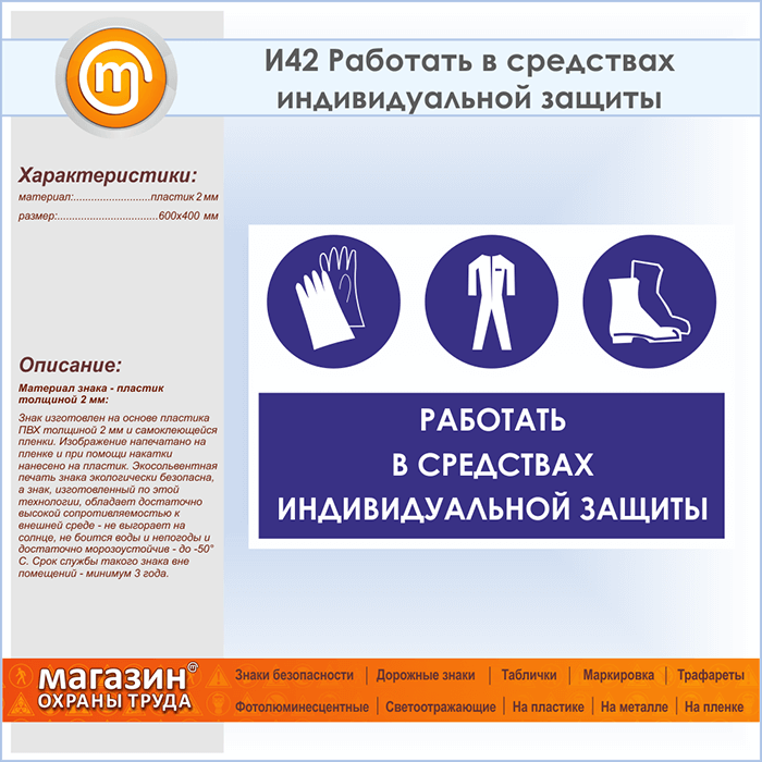 Знак «Работать в средствах индивидуальной защиты», И42 (пластик, 600х400 мм) в Альметьевске купить