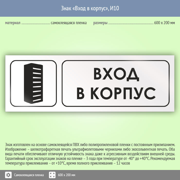 Знак «Вход в корпус», И10 (пленка, 600х200 мм) в Альметьевске купить