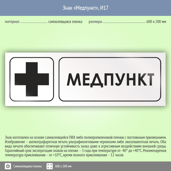 Знак «Медпункт», И17 (пленка, 600х200 мм) в Альметьевске купить