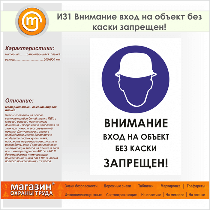 Знак «Внимание вход на объект без каски запрещен!», И31 (пленка, 600х900 мм) в Альметьевске купить