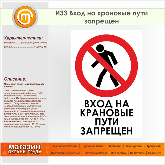 Знак «Вход на крановые пути запрещен», И33 (пленка, 600х900 мм) в Альметьевске купить