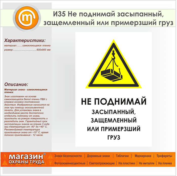 Знак «Не поднимай засыпанный, защемленный или примерзший груз», И35 (пленка, 600х900 мм) в Альметьевске купить
