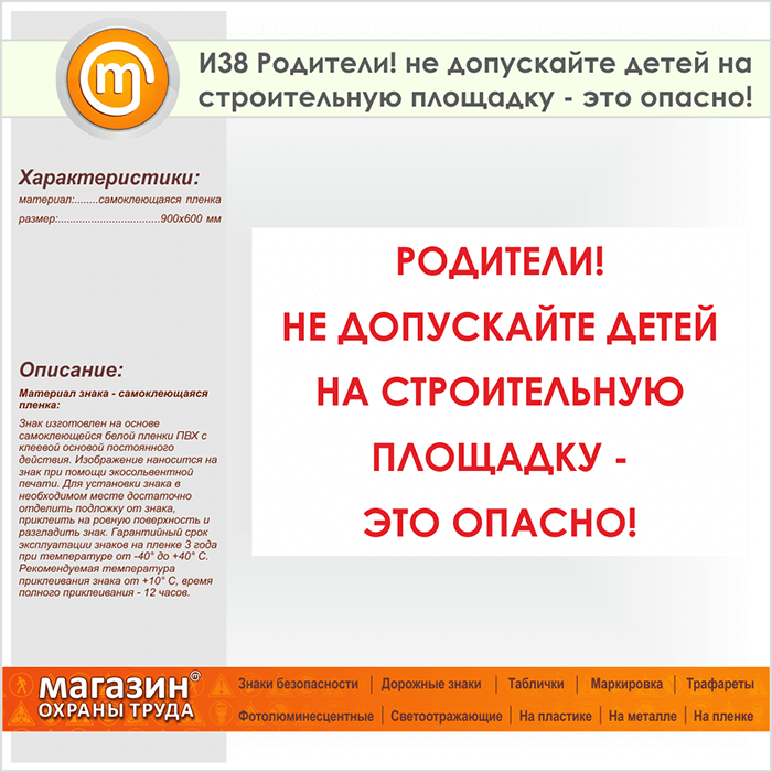 Знак «Родители! не допускайте детей на строительную площадку - это опасно!», И38 (пленка, 900х600 мм) в Альметьевске купить