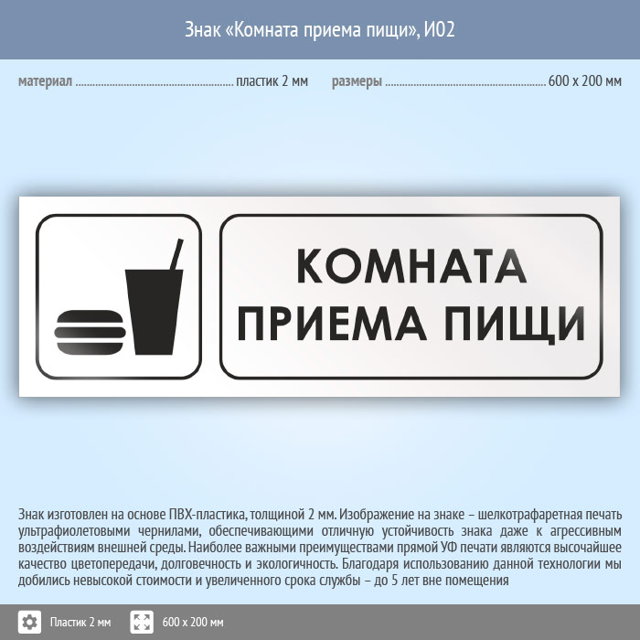 Знак «Комната приема пищи», И02 (пластик, 600х200 мм) в Альметьевске купить