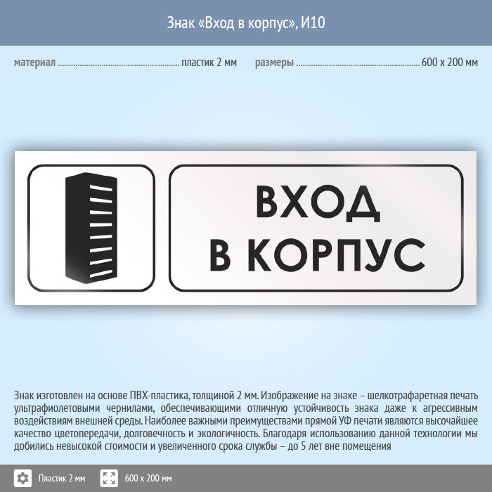 Знак «Вход в корпус», И10 (пластик, 600х200 мм) в Альметьевске купить