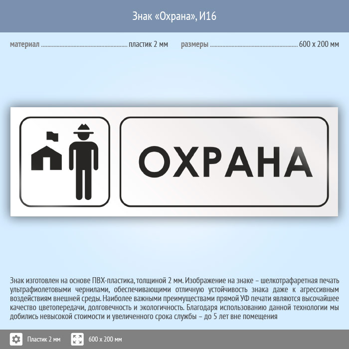 Знак «Охрана», И16 (пластик, 600х200 мм) в Альметьевске купить